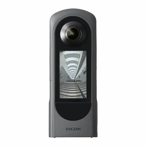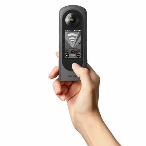 La Ricoh Theta X (2023) è una videocamera a 360 gradi dotata di uno schermo LCD touch che consente un utilizzo автономo e permette di acquisire foto sferiche da 60 megapixel e video in 5,7K a 30 fotogrammi al secondo, con memoria interna da 48 GB ed espansione tramite scheda microSD.